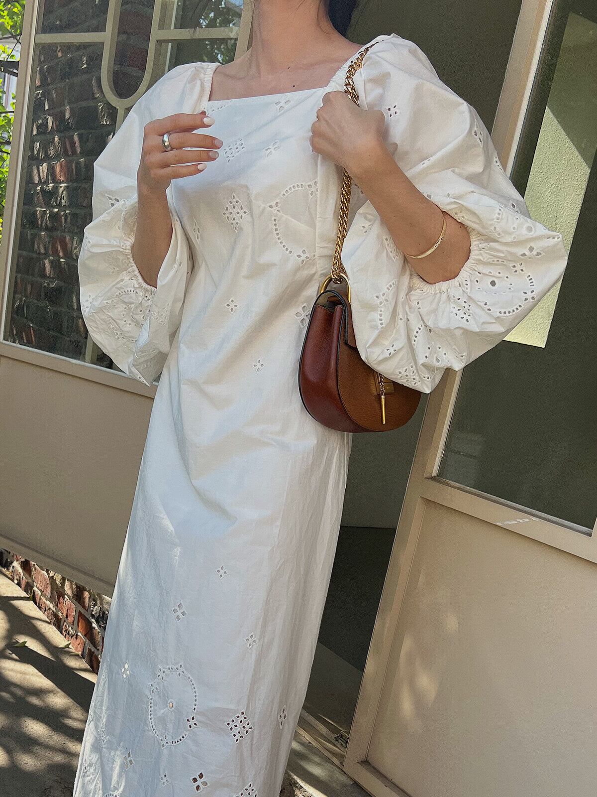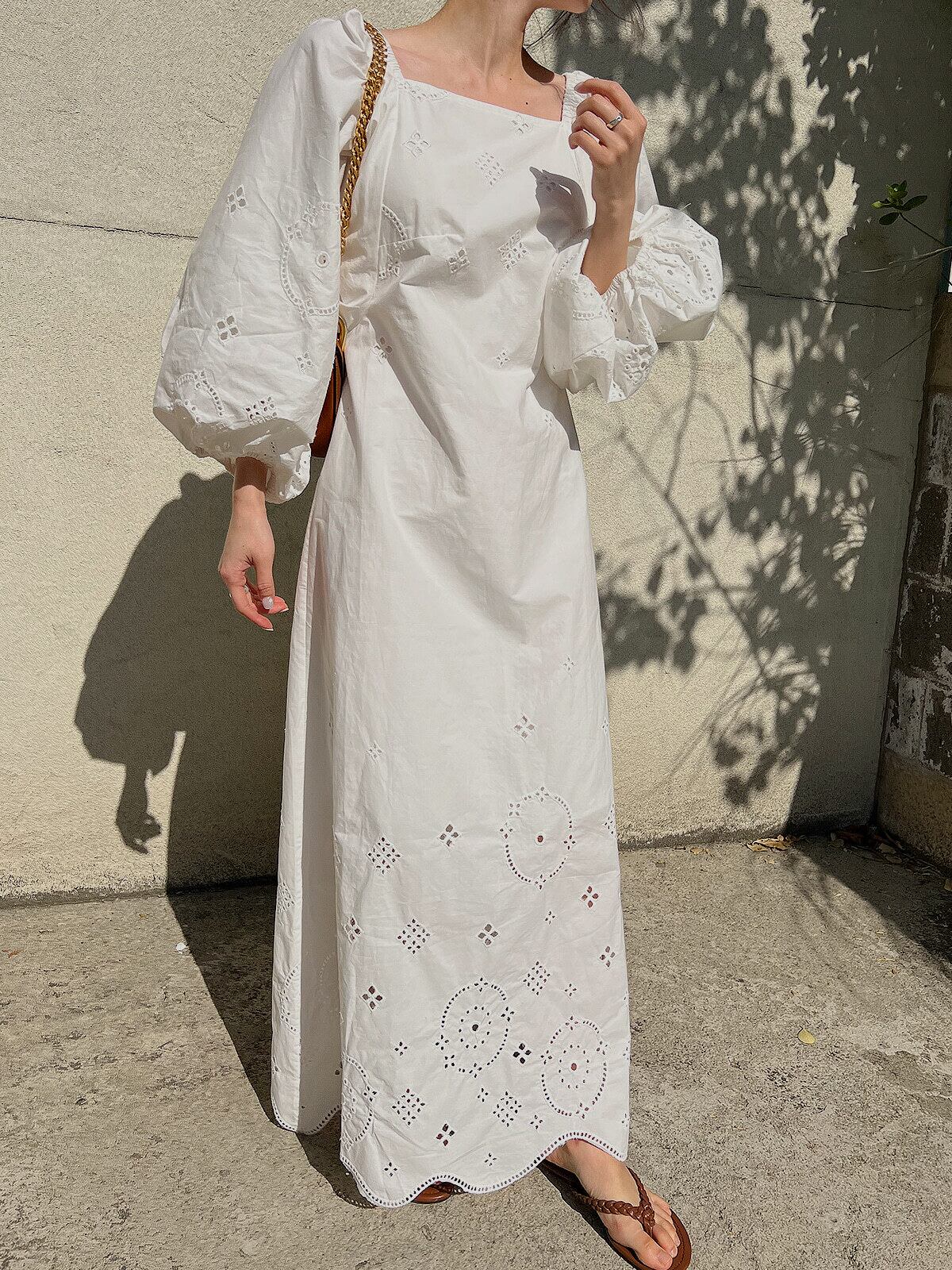 ワンピース スクエアネック ミッドレングス 刺繍 ランタンスリーブ 無地 大人可愛い 個性的 体型カバー おしゃれ かわいい シンプル カジュアル ホワイト ブラック イエロー 長袖 春 秋 上品 エレガント 10代 20代 30代