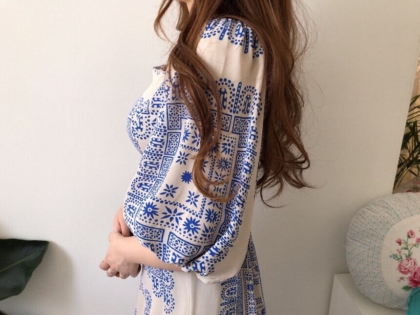 ワンピース 個性的 5分袖 スクエアネック ハイウエスト ランタンスリーブ ロング丈 柄もの 春 夏 リゾート 海 ビーチ デート 旅行 ブルー 大人可愛い レトロ かわいい おしゃれ 20代 30代