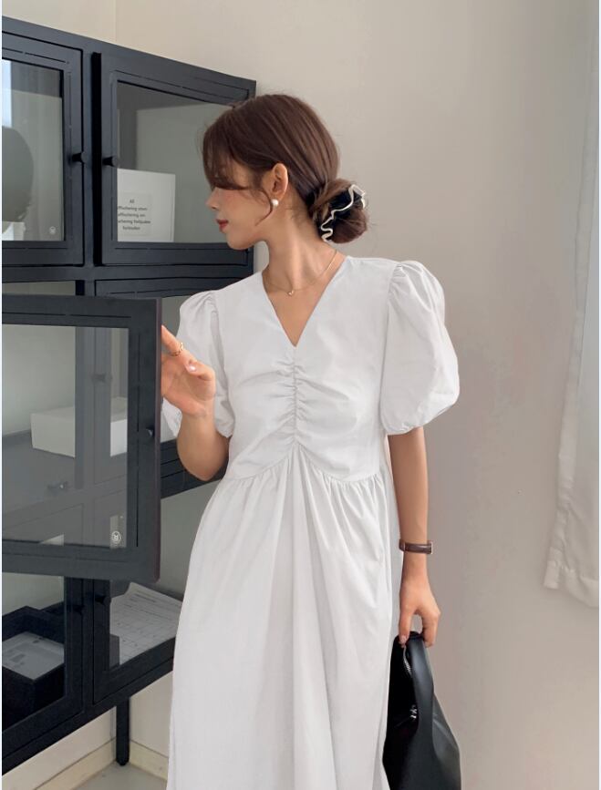ワンピース パフスリーブ ロング丈 Vネック 半袖 Aライン ふんわり ゆったり ハイウエスト ギャザー 無地 春 夏 個性的 レトロ 大人可愛い かわいい おしゃれ ブラウン ホワイト グリーン 20代 30代