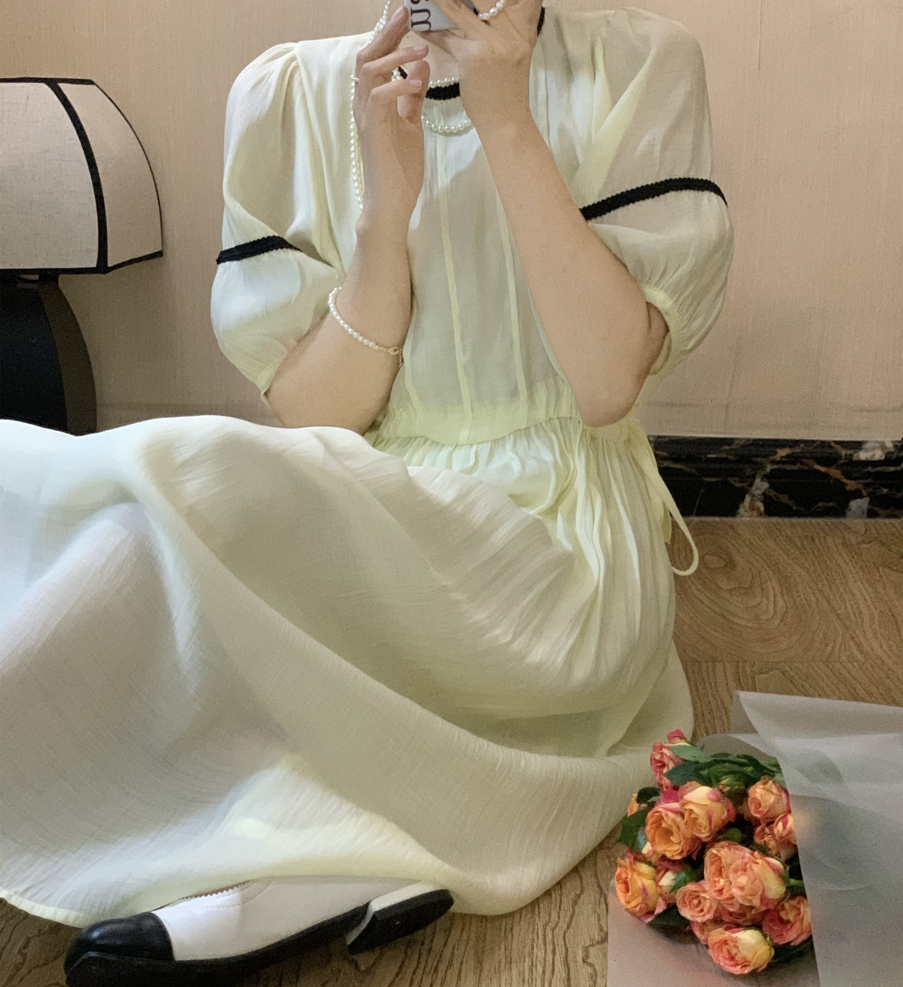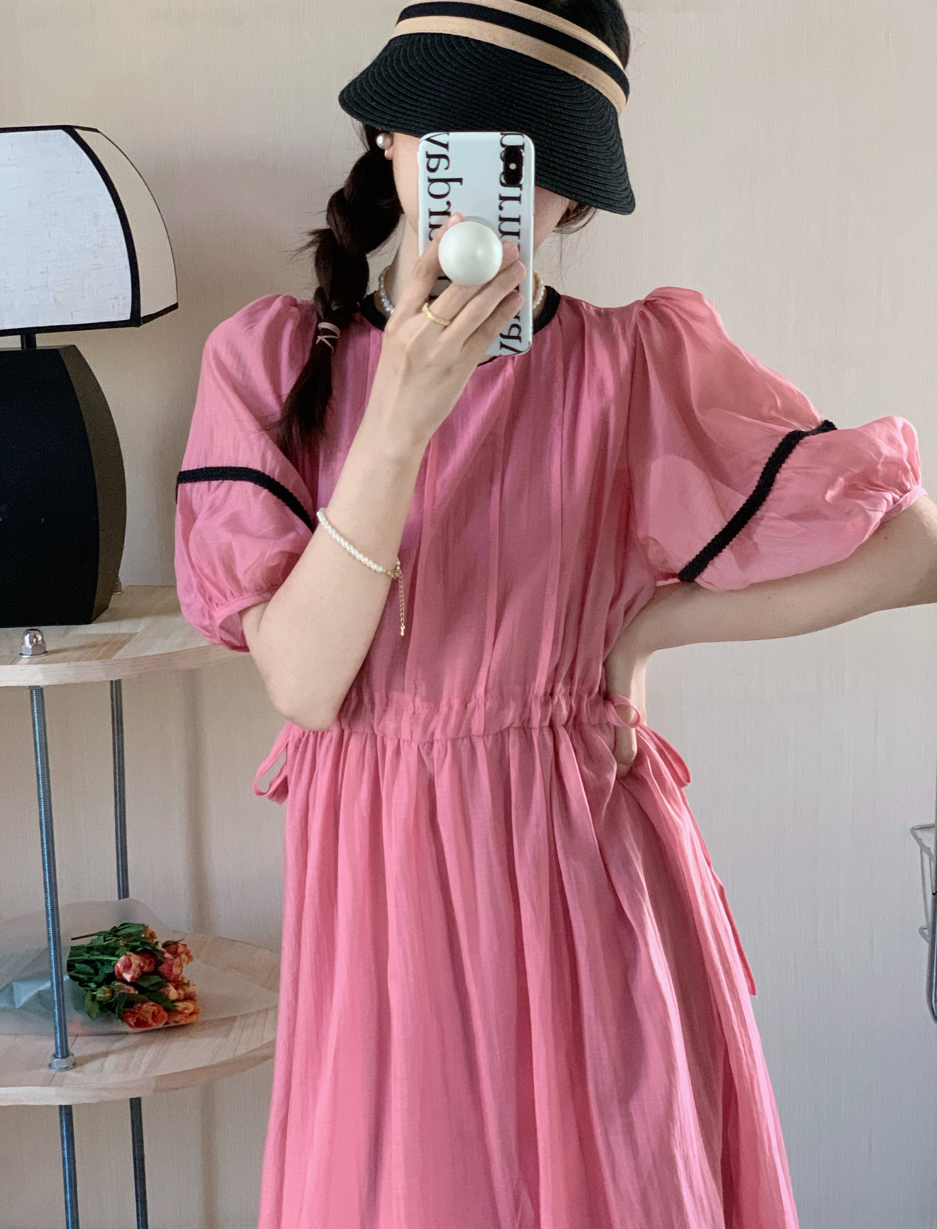 ワンピース プリーツ ラウンドネック ロング丈 体型カバー 無地 ハイウエスト 半袖 春 夏 普段使い デート ラフ おしゃれ かわいい 大人可愛い ゆったり ふんわり ピンク アプリコット 10代 20代 30代