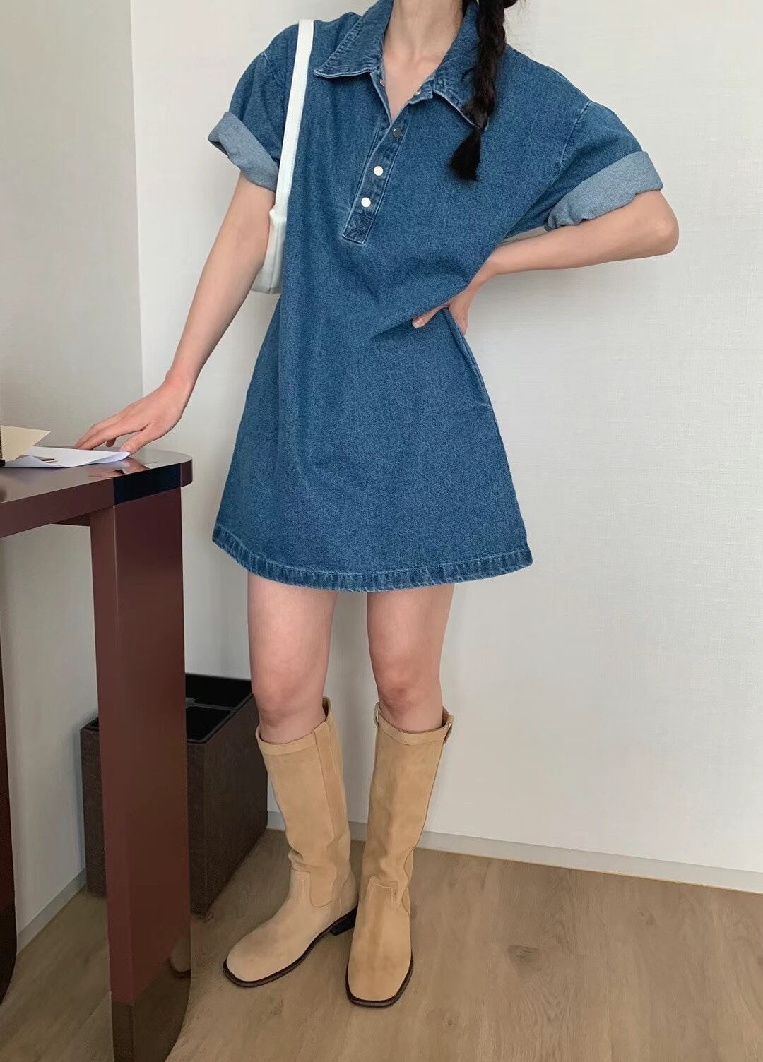 ワンピース デニム ストレート 襟付き シャツ 体型カバー 無地 半袖 春 夏 シンプル カジュアル 普段使い 個性的 人気 デート ラフ おしゃれ かわいい 大人可愛い ゆったり ブルー 10代 20代 30代