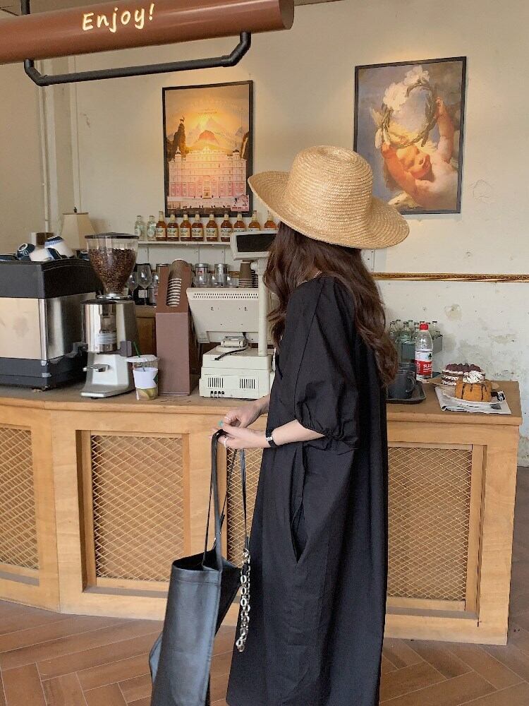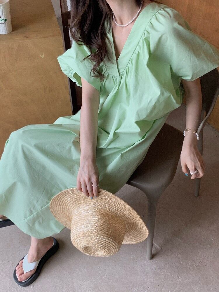 ワンピース Vネック パフスリーブ プリーツ ロング丈 ストレート 体型カバー 無地 半袖 春 夏 シンプル カジュアル 普段使い 個性的 人気 デート おしゃれ かわいい 大人可愛い 10代 20代 30代